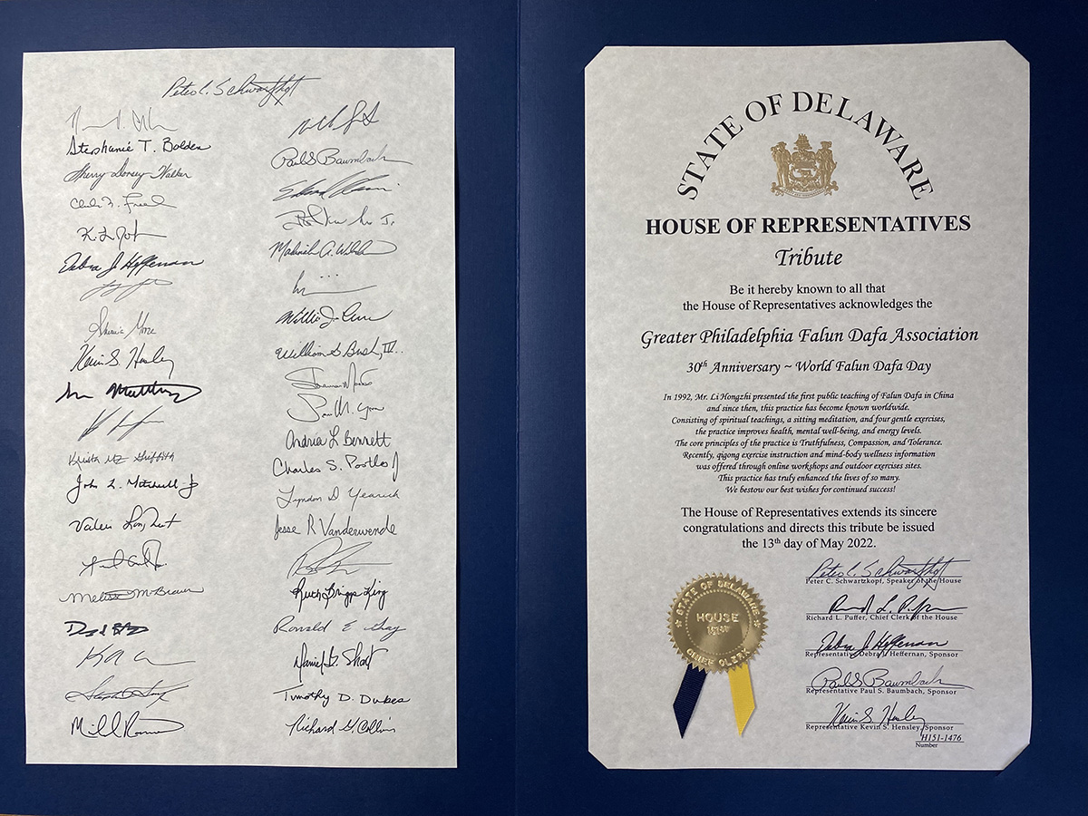 【明慧网二零二二年五月十三日】二零二二年五月十三日,在法轮大法洪传世界三十周年之际,美国德拉华州众议院颁发褒奖,赞颂法轮大法改善了无数人的生活。五月十一日上午,在纽瓦克市Deer Park Tavern餐馆举办的与选民见面会上,德拉华州众议员保罗·鲍姆巴赫(Paul Baumbach)亲自向法轮大法学员颁发了褒奖,并向法轮大法创始人李洪志先生表达了敬仰。 图1:五月十一日,德拉华州众议员保罗·鲍姆巴赫(右二)向法轮大法学员颁发德拉华州众议院褒奖,祝贺法轮大法洪传世界三十周年。 |