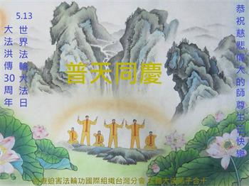 追查迫害法轮功国际组织台湾分会全体大法弟子恭祝慈悲伟大的师尊生日快乐!普天同庆世界法轮大法日暨大法洪传三十周年!