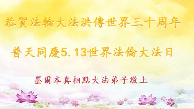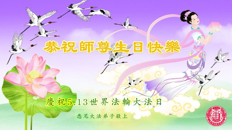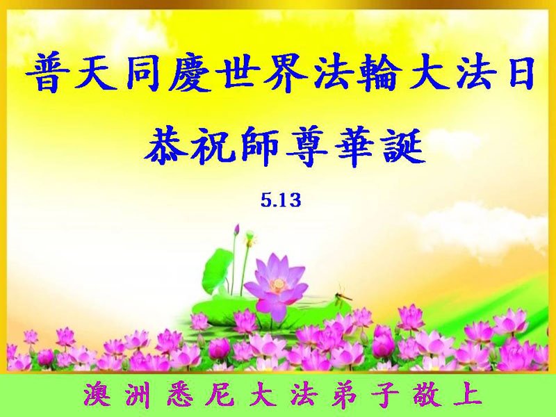恭祝慈悲伟大的师尊生日快乐! 普天同庆5·13世界法轮大法日! 祝贺法轮大法洪传三十周年! 紧跟师父的正法進程,做好三件事,精進实修。 悉尼一大法弟子敬上 澳大利亚悉尼大法弟子恭祝慈悲伟大的师尊生日快乐!