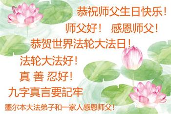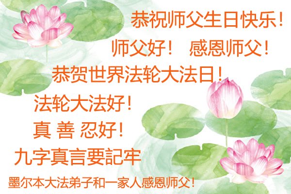 这个特殊的日子里:恭祝慈悲伟大的师尊华诞!恭庆第二十三届世界法轮大法日!恭贺法轮大法洪传三十周年!感恩师尊的慈悲救度! 澳大利亚墨尔本三名大法弟子叩谢师恩!恭祝师父生日快乐!恭贺法轮大法洪传三十周年!衷心感谢师尊的慈悲救度,谢谢师父!