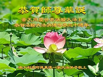 悉尼一大法弟子恭贺世界法轮大法日!庆祝法轮大法洪传三十周年!恭祝师父生日快乐!