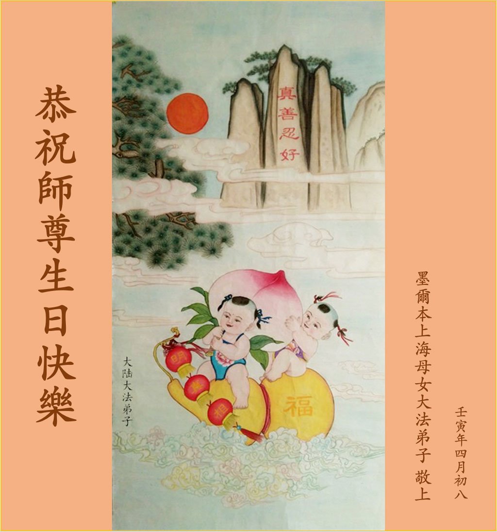 师恩难报!弟子唯有精進再精進,做好三件事,不辜负师父的慈悲苦度。弟子在此深深叩拜师父! 澳大利亚悉尼母女大法弟子恭祝慈悲伟大的师尊生日快乐!