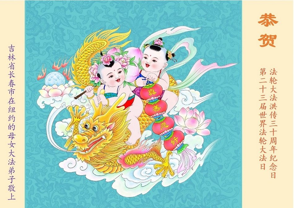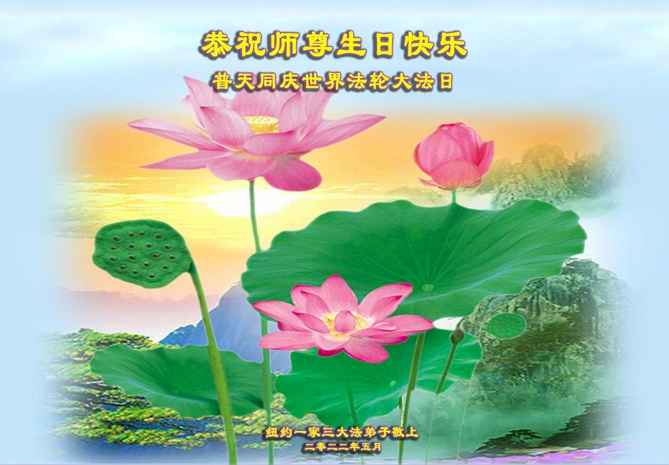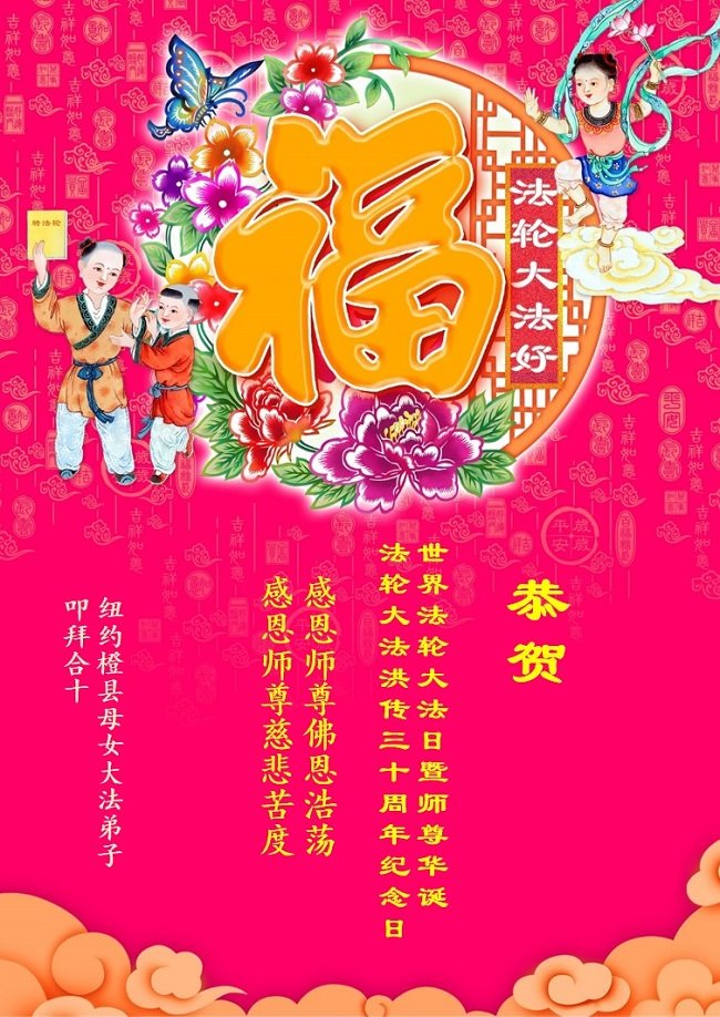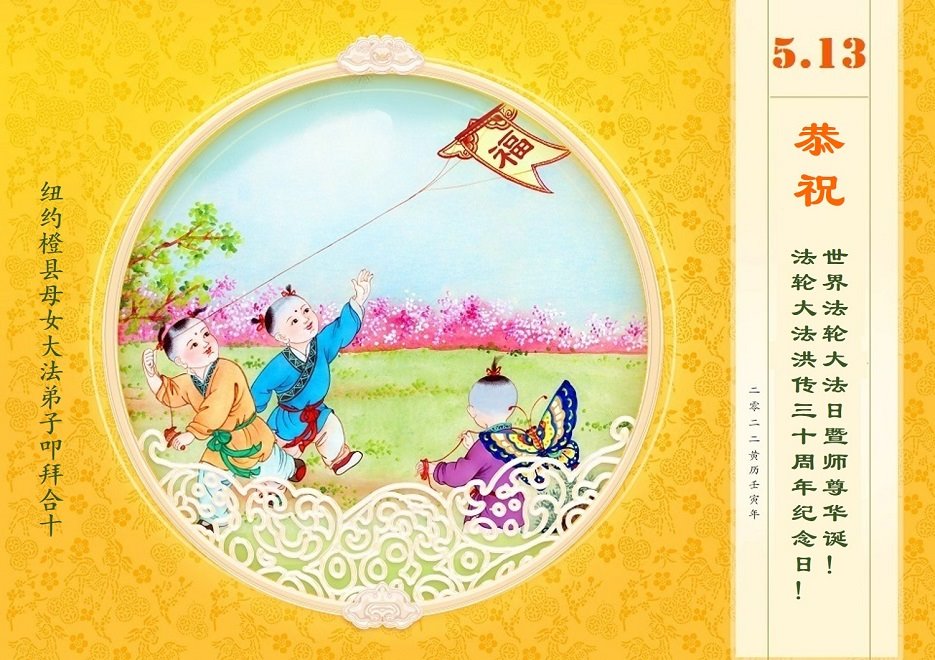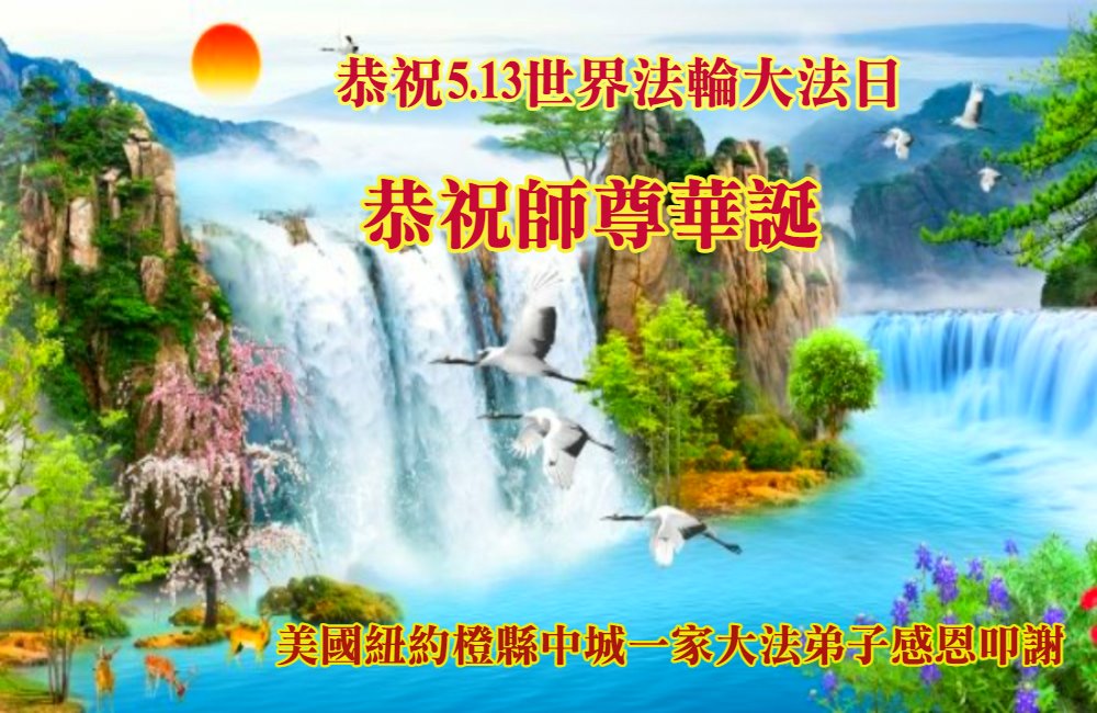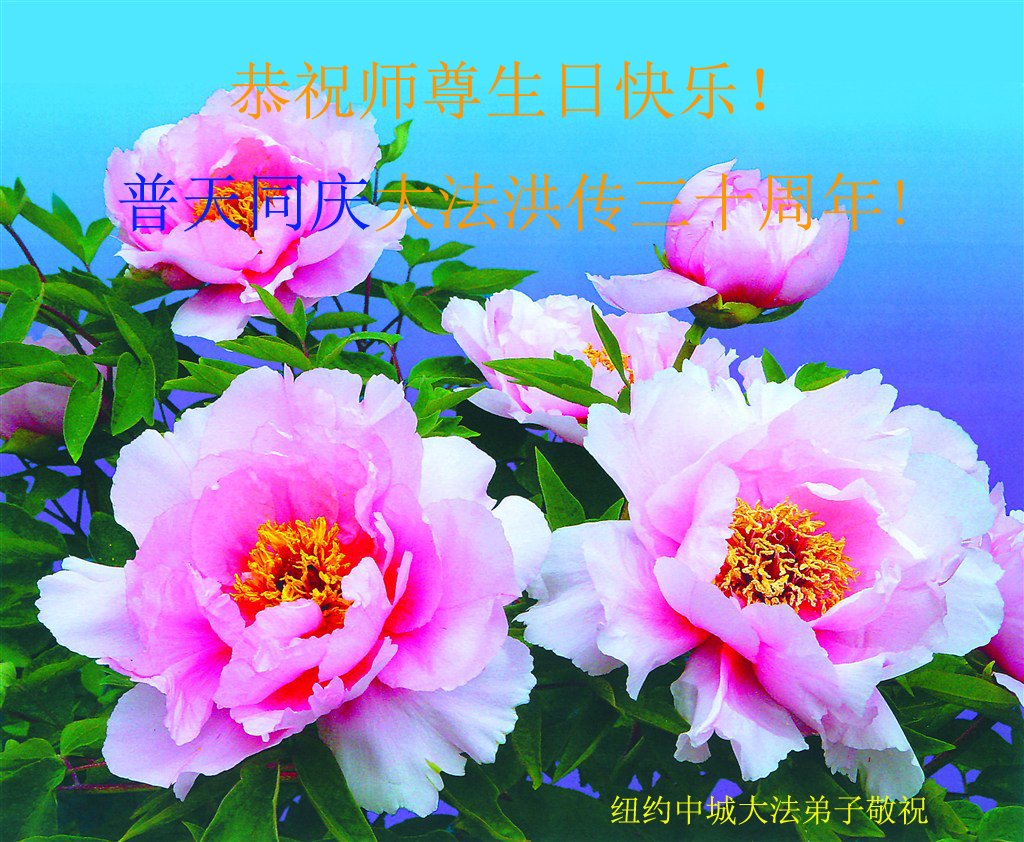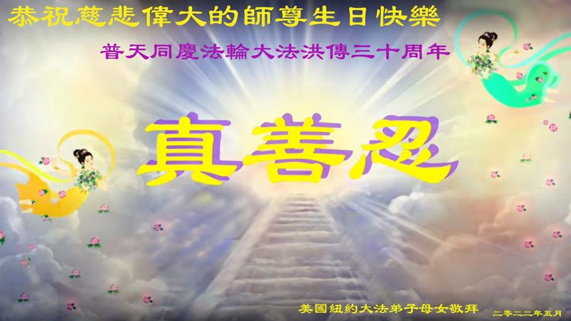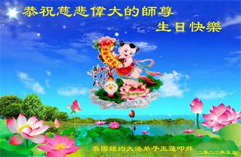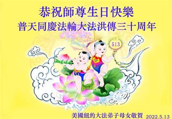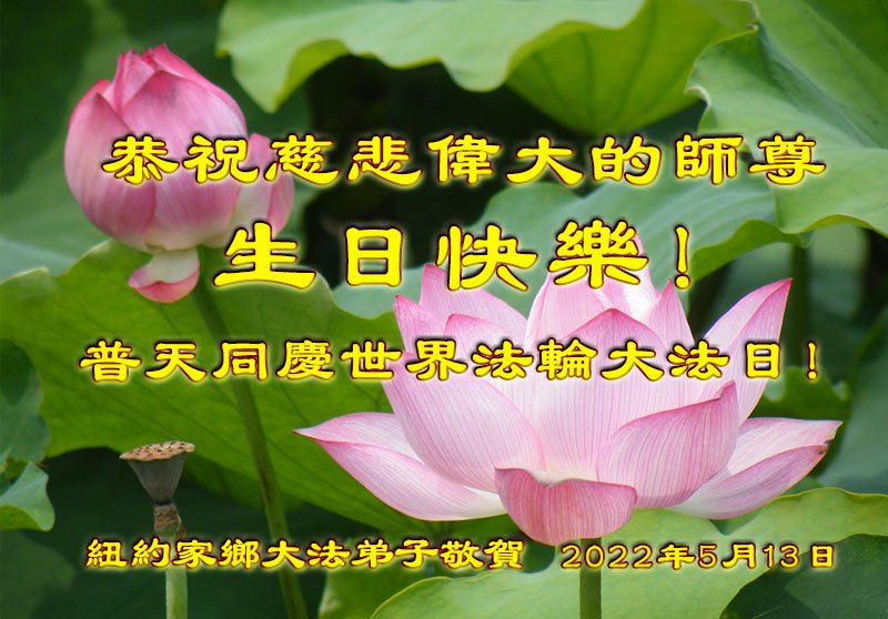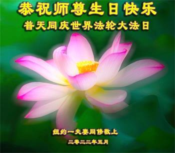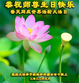 美国纽约大法弟子恭祝慈悲伟大的师父生日快乐! 祝贺5·13世界法轮大法日! 祝贺法轮大法洪传三十周年! 纽约大法弟子姐妹和外甥女合十敬上 美国纽约大法弟子恭祝慈悲伟大的师尊生日快乐!