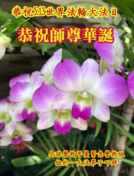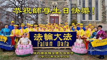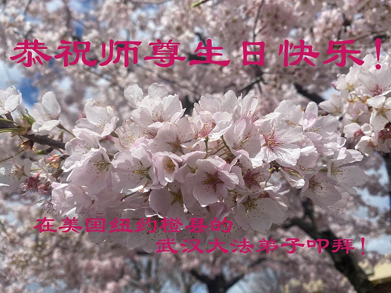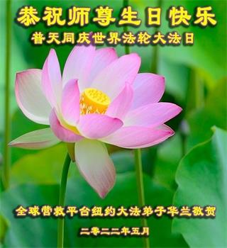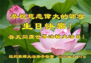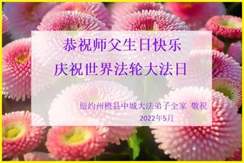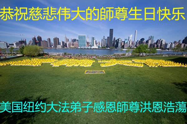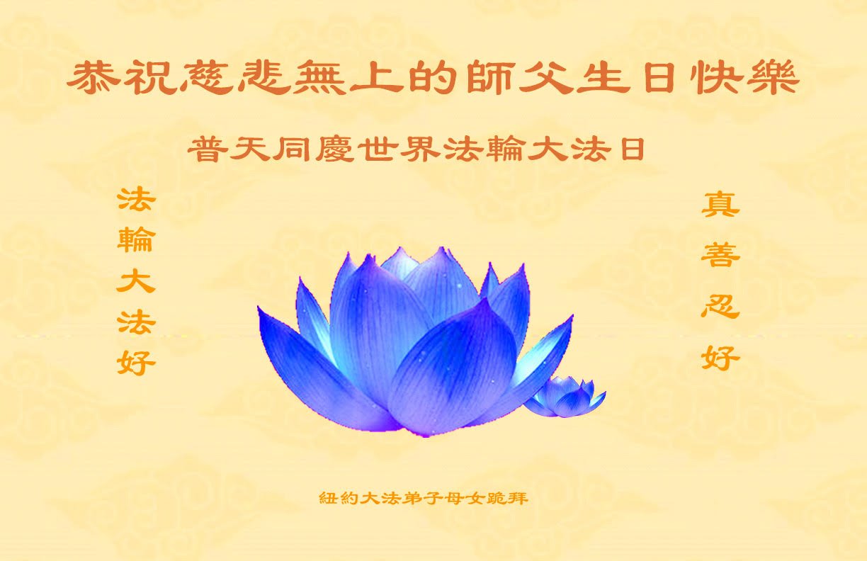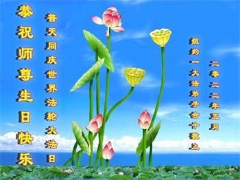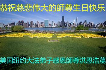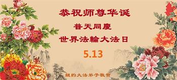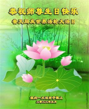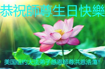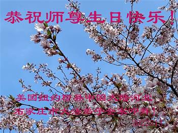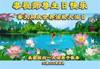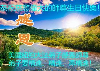 感恩师尊的慈悲救度!弟子一定要完成历史使命,修好自己,助师救度众生,坚定不移跟师父走到底。 纽约大法弟子恭祝师尊生日快乐!恭贺世界法轮大法日!