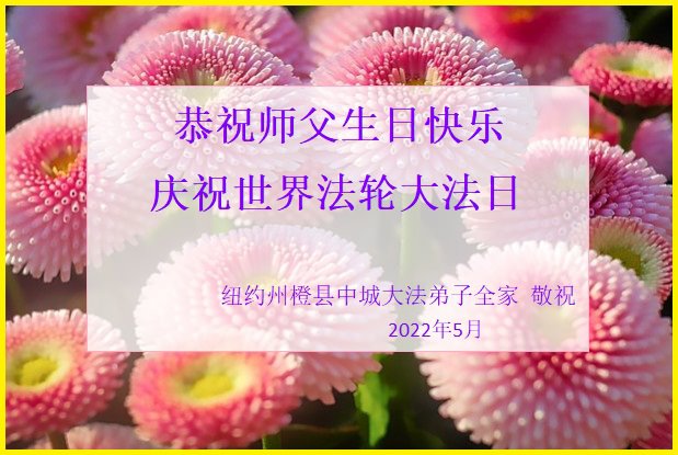 值此世界法轮大法日、法轮大法洪传三十周年、师尊华诞这普天同庆震撼寰宇最伟大而殊胜的日子里,纽约橙县母女大法弟子恭祝慈悲伟大的师尊生日快乐!师父你辛苦了!弟子叩拜谢师恩! 纽约橙县母女大法弟子叩拜 2022年5月 10日 美国纽约大法弟子恭祝慈悲伟大的师尊生日快乐!