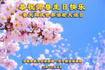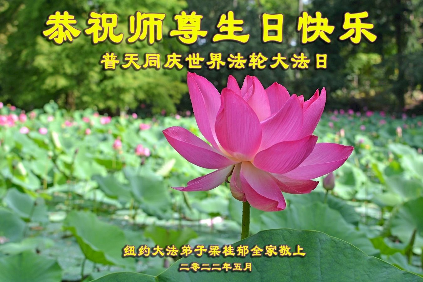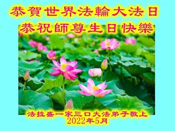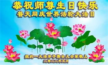 恭祝慈悲伟大的师尊生日快乐!天上人间恭贺法轮大法洪传三十周年! 普天同贺5·13世界法轮大法日!法轮大法好!真善忍好! 纽约大法弟子梁桂郁全家敬上 美国纽约大法弟子恭祝师尊生日快乐!
