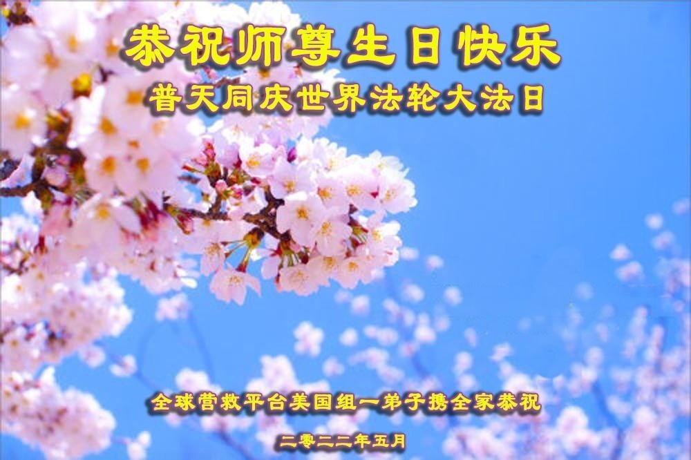在这世界法轮大法日,法轮大法洪传世界30周年,师尊华诞的神圣的节日里,弟子恭祝师尊生日快乐!感恩师尊慈悲救度。 长春在纽约橙县的母女大法弟子叩拜合十 2022年5月10日 美国纽约上州一家大法弟子恭祝师尊生日快乐!普天同庆世界法轮大法日!