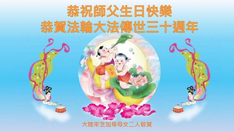 美国芝加哥母女俩恭祝师父生日快乐!恭贺法轮大法传世三十周年!