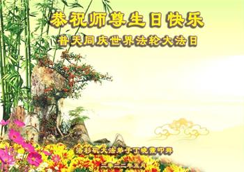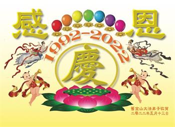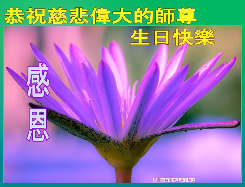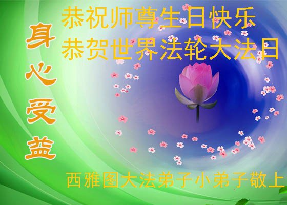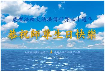 值此大法洪传三十周年之际,无比感恩师尊的慈悲苦度!弟子们会努力修好自己,抓紧时间做好三件事,多救人。叩谢师恩! 西雅图大法弟子和大法小弟子恭贺世界法轮大法日!恭祝师尊生日快乐!