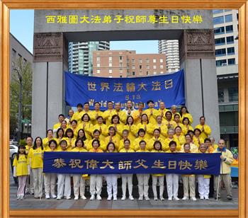 美国西雅图大法弟子恭祝师尊生日快乐!恭贺世界法轮大法日!