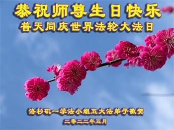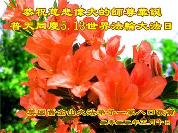 恭祝慈悲伟大的师尊生日快乐! 普天同庆5·13世界法轮大法日! 洛杉矶一学法小组丁晓霞、李洁范、顾丽清、舒德宝、孙小明敬贺 美国旧金山大法弟子一家八口恭祝慈悲伟大的师尊华诞!