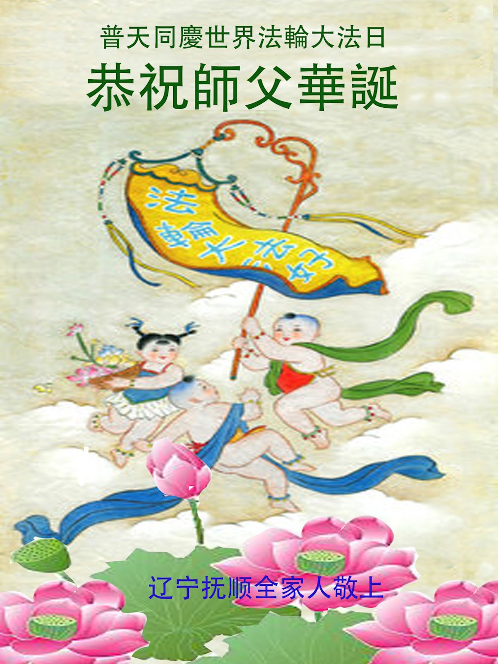 辽宁省阜新市一家庭资料点大法弟子恭祝慈悲伟大的师尊生日快乐!祝贺法轮大法洪传世界三十周年! 师父您辛苦了!在这普天同庆的日子,弟子感恩师父的慈悲苦度,谢谢慈悲伟大的师父! 辽宁省抚顺一大法弟子恭祝慈悲伟大的师尊生日快乐!恭贺世界法轮大法日!