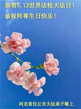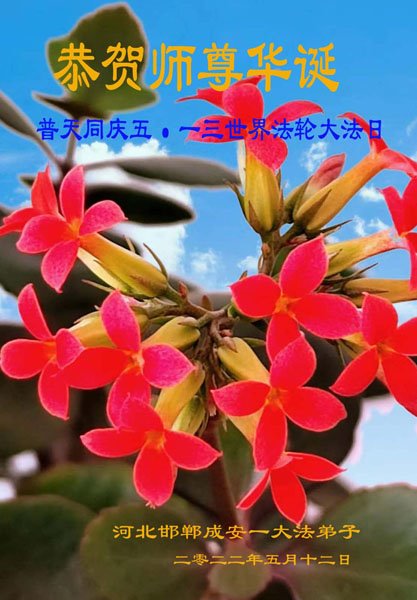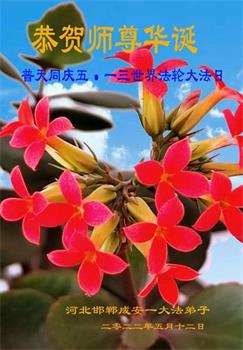 师父您好: 风雨坎坷中,我们迎来又一个法轮大法日,我们会在大法的历炼和师父的保护下更加坚定,跟随师父走好最后的路,请师父放心! 河北省平乡县全体大法弟子 二零二二年五月十二日 河北省邢台市平乡县一大法弟子恭祝师父生日快乐!恭贺世界法轮大法日!