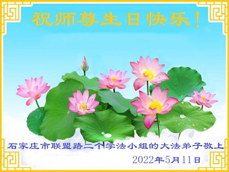 师尊辛苦了!感恩师尊的慈悲救度! 弟子们会相互帮助,整体提升,做好三件事,跟上师父的正法進程,不辜负师尊的慈悲救度,兑现史前誓约,圆满随师还。 石家庄市赞皇县一学法小组大法弟子 二零二二年五月十一日 河北省石家庄市青园街一学法小组大法弟子及附近两名大法弟子恭祝伟大的师尊生日快乐!