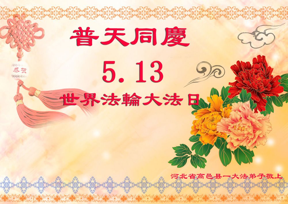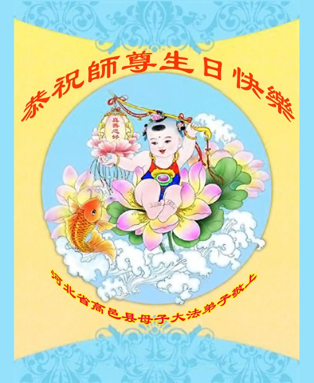 在最后时间里,努力学好法,去人心,努力去救人。 5.13法轮大法日之际,代俩女儿恭祝师尊生日快乐!感恩师尊的慈悲保护!俩个女儿在外地工作,明白大法真相,知道法轮大法好,受益良多,险中托师尊的保护,化险为夷。 师尊好!法轮大法好! 弟子叩拜师尊! 河北省石家庄市高邑县母子大法弟子恭祝师尊生日快乐!