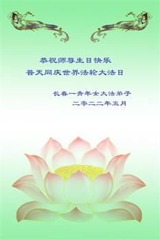 吉林省长春朝阳区大法弟子 2022年5月11日 吉林省长春一老年大法弟子恭贺世界法轮大法日!恭祝慈悲伟大的师尊生日快乐!