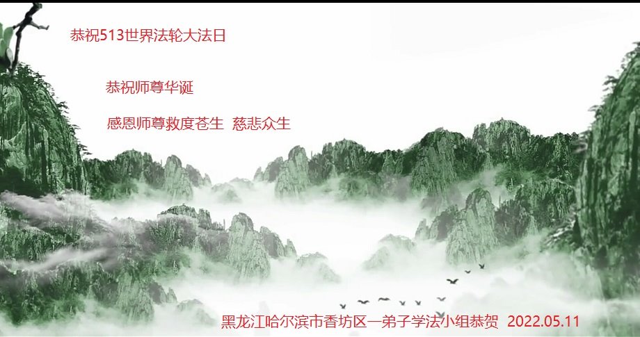 【明慧网二零二二年五月十四日】 黑龙江省哈尔滨市阿城市区一全家大法弟子恭贺世界法轮大法日暨师尊华诞!