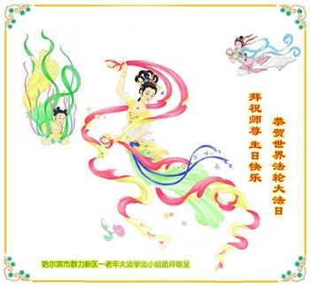 黑龙江省哈尔滨群力新区一老年学法小组大法弟子恭祝师尊生日快乐!恭贺世界法轮大法日!