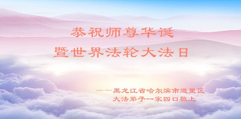 黑龙江省哈尔滨市大法弟子一家四口恭祝师尊生日快乐!恭贺世界法轮大法日!