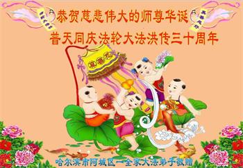 黑龙江省哈尔滨一全家大法弟子恭祝法轮大法日暨师尊七十一岁华诞!