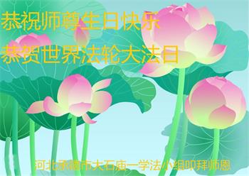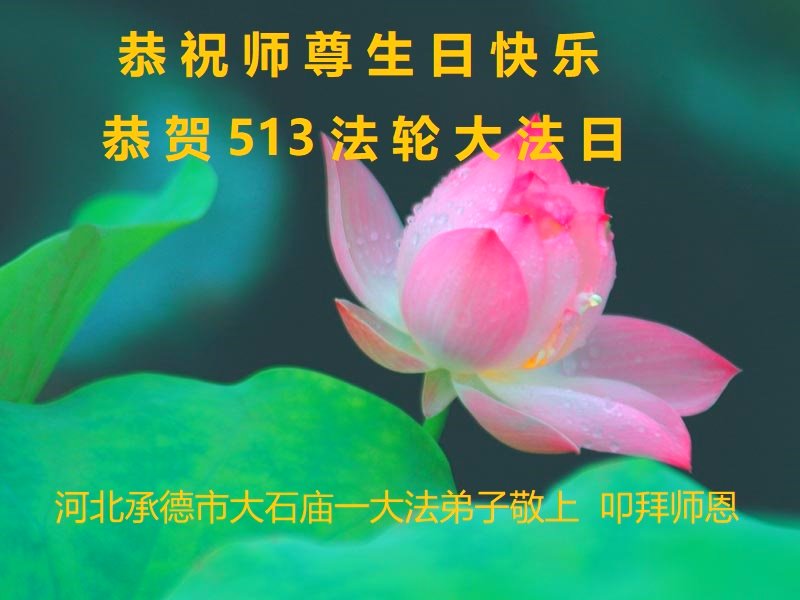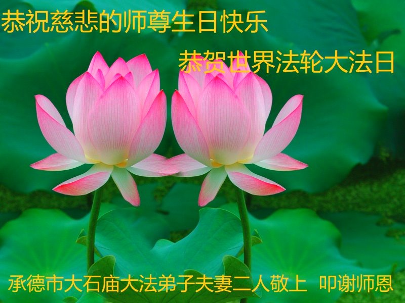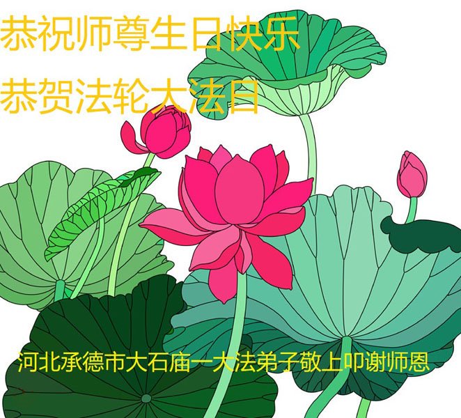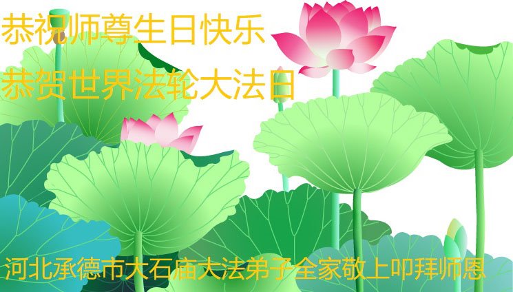 弟子们要多学法,修好自己,多救人,完成使命,跟师尊回家。 河北省承德市大石庙夫妻大法弟子恭祝师尊生日快乐!恭贺世界法轮大法日!