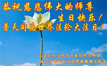 愿师尊永远快乐。弟子盼您早日回大陆,弟子想念您。 河北邯郸市丛台区东北片一学法小组大法弟子恭祝师尊生日快乐!恭贺世界法轮大法日!