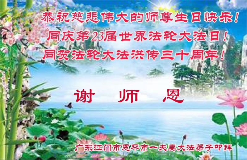 恭祝慈悲伟大的师尊生日快乐! 同庆第23届世界法轮大法日! 同贺法轮大法洪传三十周年! 谢师恩! 广东江门市恩平市一夫妻大法弟子叩拜 广东省江门市恩平市一母女大法弟子恭祝慈悲伟大的师尊生日快乐!