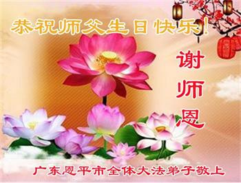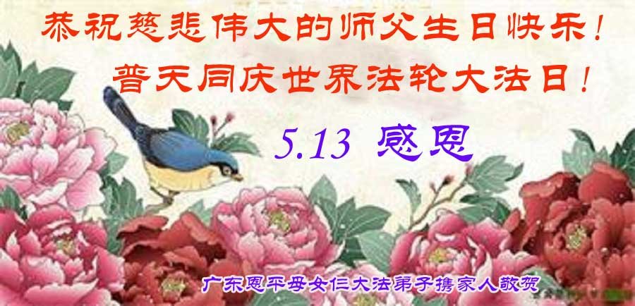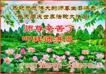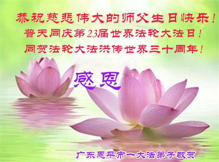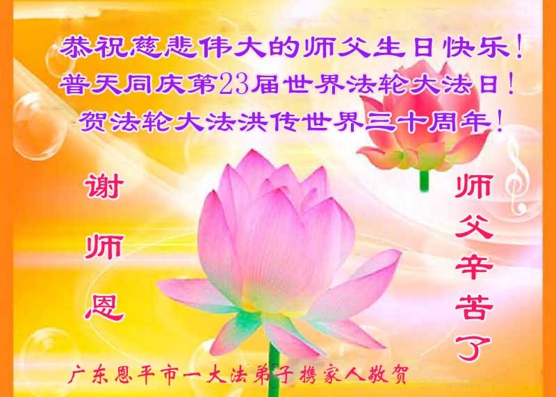普天同庆世界法轮大法日! 贺法轮大法洪传三十周年 广东恩平市一大法弟子携家人敬上 广东省江门市恩平市全体大法弟子恭祝师父生日快乐!