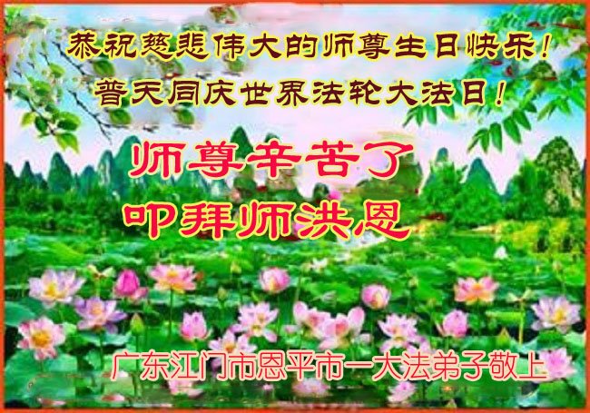 恭祝慈悲伟大的师尊生日快乐! 普天同庆世界法轮大法日! 师尊辛苦了! 叩拜师洪恩! 广东江门市恩平市大法弟子敬上 广东省江门市恩平市一大法弟子恭祝师父生日快乐!