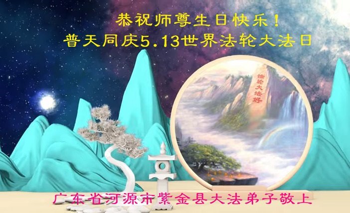 在我们尊敬的师父的生日来临之际,我们怀着无比感恩的心情,感谢师父的慈悲苦度!感谢师父的慈悲看护!恭祝慈悲伟大的师尊生日快乐!热烈祝贺法轮大法洪传三十周年!热烈庆祝第二十三届世界法轮大法日! 在剩下很有限的给我们证实法救众生的日子里,弟子要紧紧抓住每一次修炼提高的机会,放下人心,主动自觉无条件向内找自己的问题并修好自己。严格按照师尊的谆谆教诲:正法需要,师父叫做什么就做什么。救人需要,想做什么就做什么,想做多少就做多少。尽心尽力做好自己该做的事,给师父交上一份合格满意的答卷! 弟子合十叩拜师尊! 广东梅州市五华县全体大法弟子恭祝慈悲伟大的师尊生日快乐!