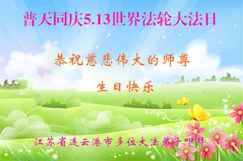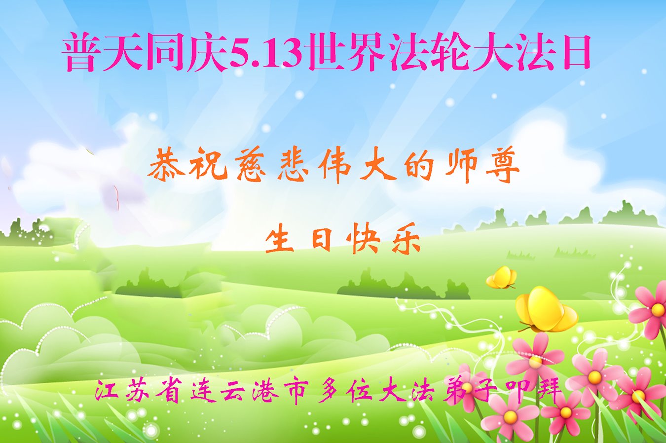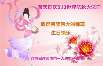 普天同庆5.13世界法轮大法日!弟子恭祝慈悲伟大的师尊生日快乐! 弟子无比感恩师尊的慈悲救度,弟子每走一步都离不开师父的保护,在正法最后的日子里,弟子一定要做好三件事,多救人兑现来世誓约。 江苏省连云港市多位大法弟子恭祝慈悲伟大
