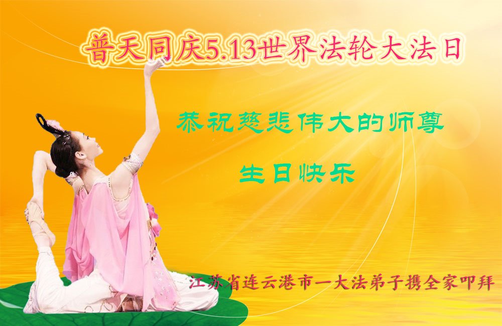 的师尊生日快乐! 普天同庆5.13世界法轮大法日! 江苏省连云港市一大法弟子携全家恭祝慈悲伟大的师尊生日快乐!