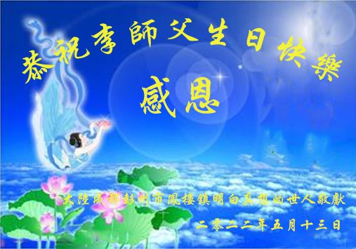 【明慧网二零二二年五月十四日】 四川省成都市彭州市凤楼镇明白真相人士恭祝李大师生日快乐!