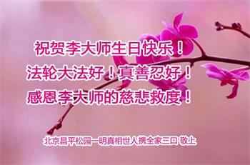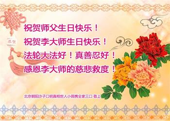内蒙古宝昌一家三口法轮功学员携带明白真相的家人、亲友恭祝师父华诞并祝贺世界法轮大法日!