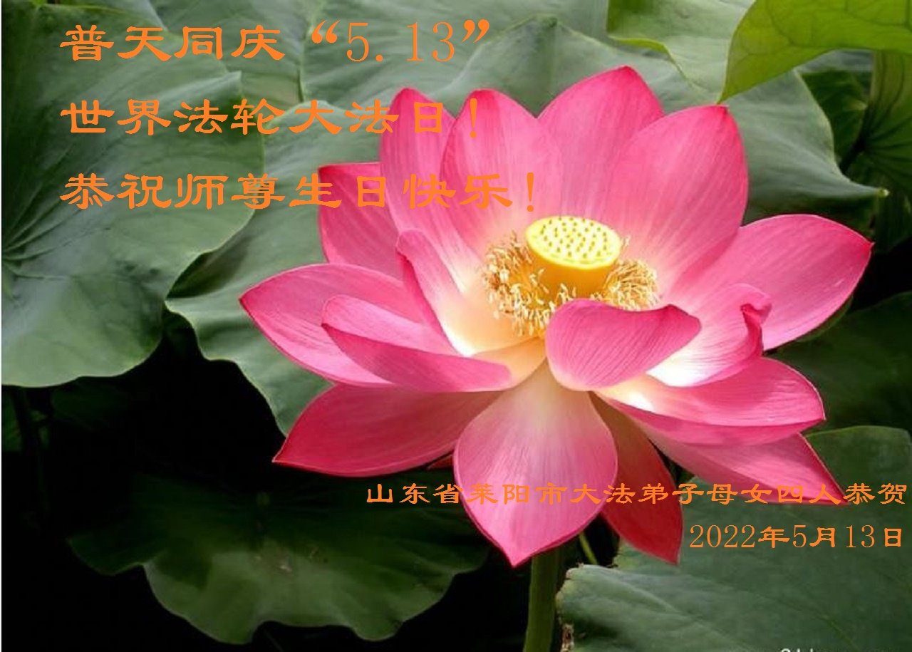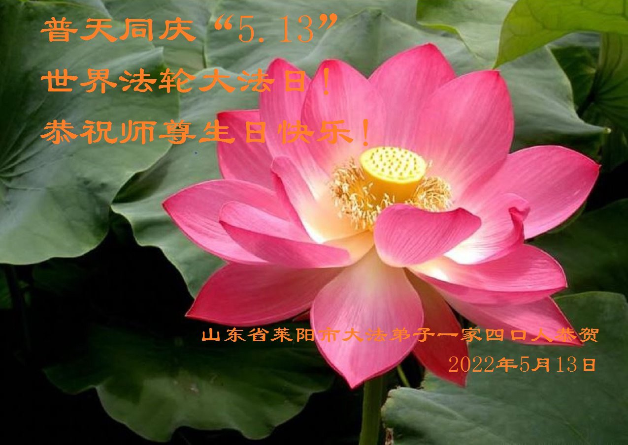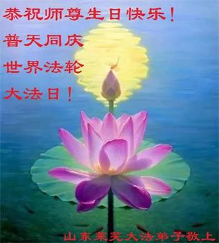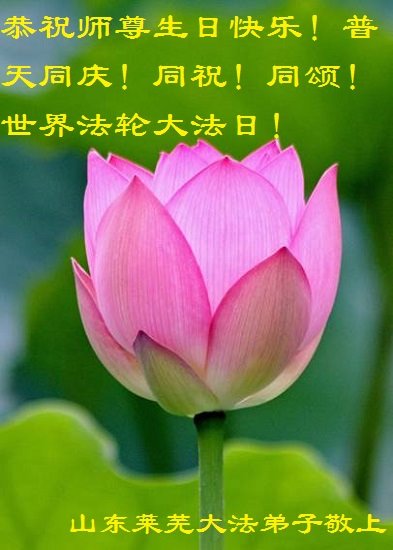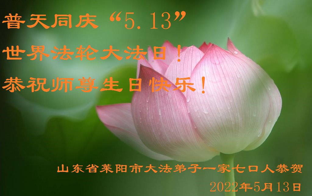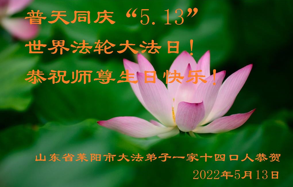 山东省莱阳市一家五名大法弟子代表全家八口人向慈悲伟大的师父致以崇高的敬意,衷心恭祝慈悲伟大的师尊生日快乐!恭贺世界法轮大法日!弟子们双手合十向师尊致以节日的问候:师父,您好!师父,您辛苦了! 弟子们感谢您的慈悲苦度。 山东莱芜大法弟子恭贺世界法轮大法日!