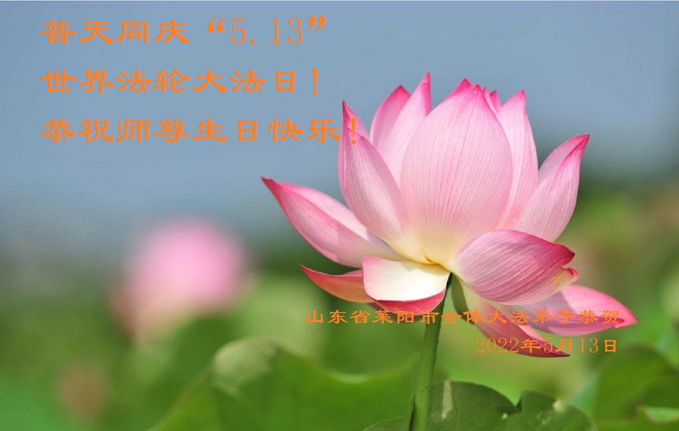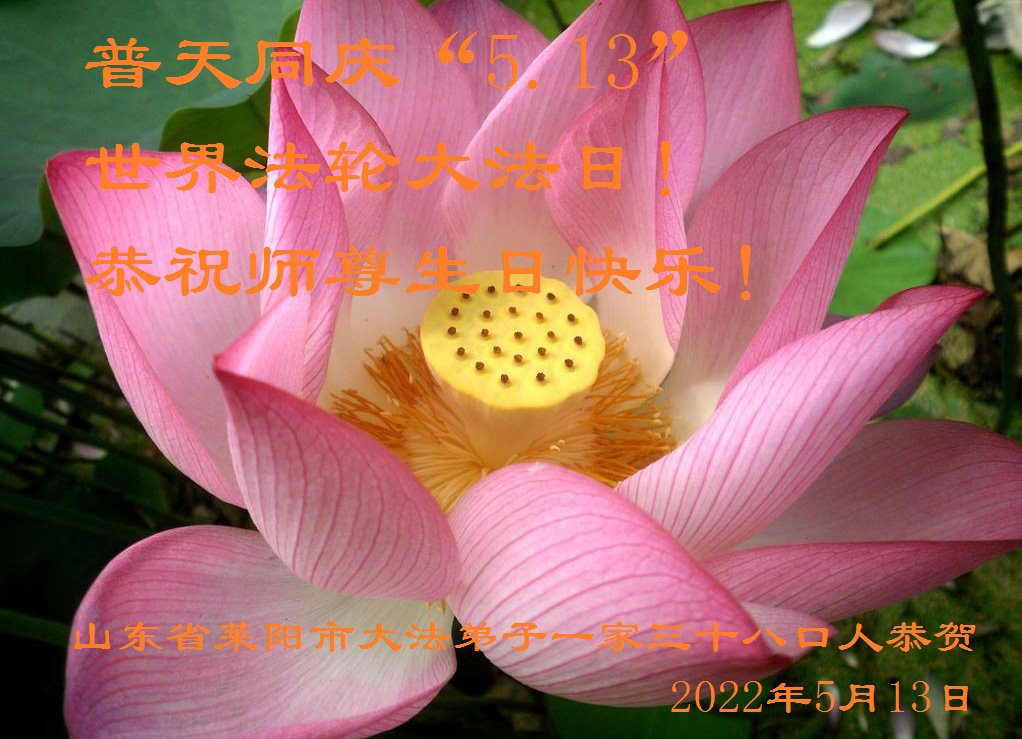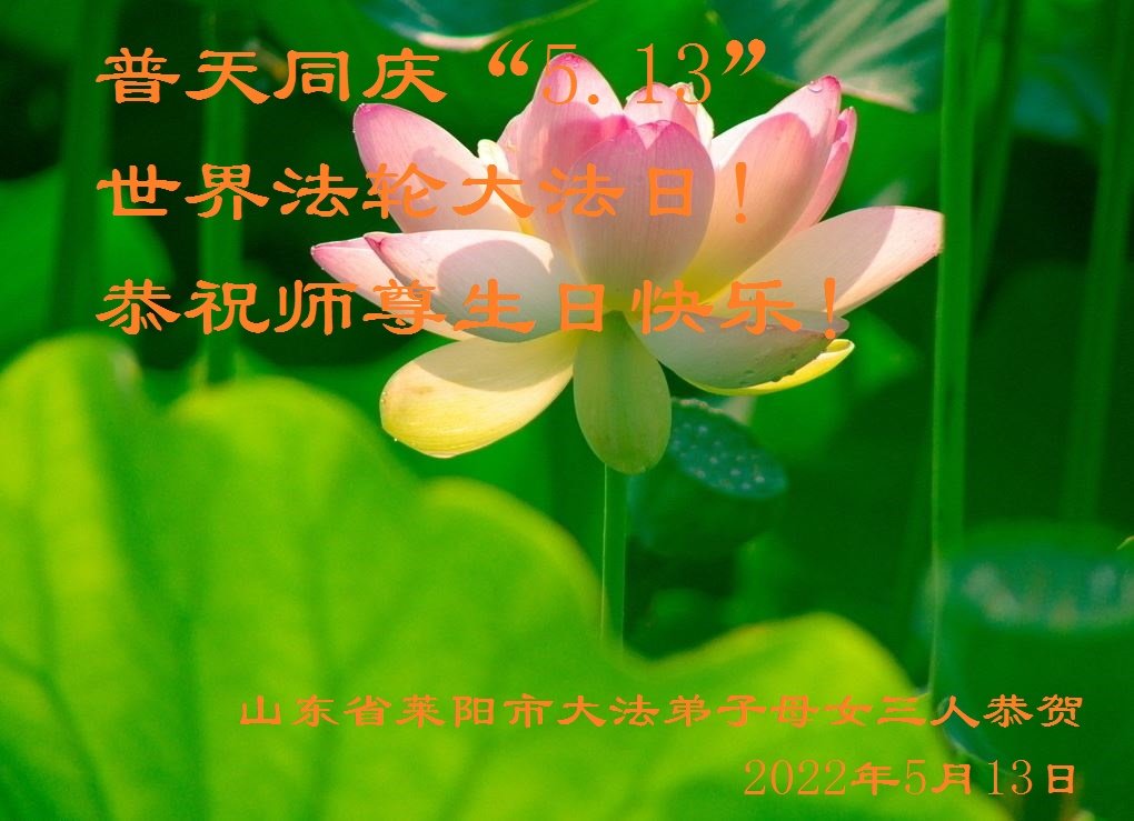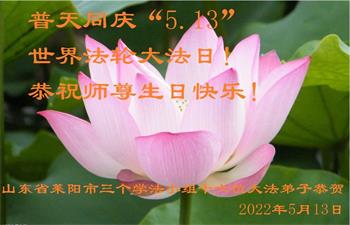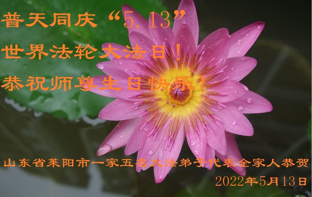 山东省莱阳市一家五名大法弟子代表全家八口人向慈悲伟大的师父致以崇高的敬意,衷心恭祝慈悲伟大的师尊生日快乐!恭贺世界法轮大法日!弟子们双手合十向师尊致以节日的问候:师父,您好!师父,您辛苦了! 弟子们感谢您的慈悲苦度。 山东莱芜大法弟子恭贺世界法轮大法日!