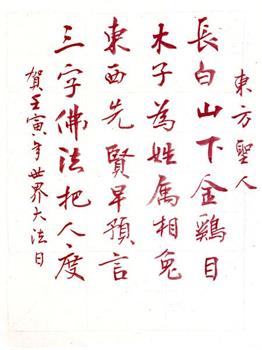 春醒花开遍大千 喜迎五月十三日 祝师父生日快乐! 大法徒普天同欢 创世主造万物 穹宇天体神佛大显 大法博大精深法理 学者修心正念强 真善忍普世价值洪传 开天辟地头一回 大法洪传世间 生命无比珍惜 与佛法结圣缘 大法弟子救度众生遍地开莲 盼望慈悲伟大的师尊回中原 白洋淀地区大法弟子恭祝慈悲伟大的师父生日快乐!