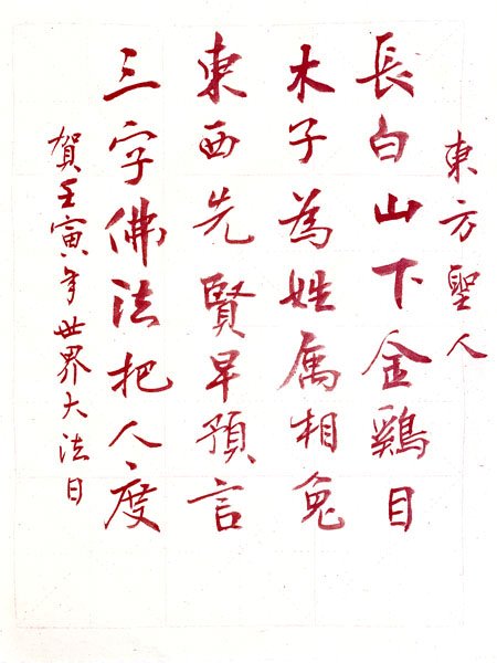 长天碧水,和风祥云。 桃李芳菲,春满乾坤。 在法轮大法洪传三十周年之日,弟子向慈悲伟大的师尊致以最诚挚的感恩与最崇高的敬意!恭祝师尊生日快乐!恭贺五·一三世界法轮大法日!法轮大法好,真善忍好,师尊好! 师尊为了无量众生得度操尽了心,弟子们要更加努力学好法,一切事用法衡量,不断坚定正念,做好三件事,兑现助师救人的誓约! 恭诵天书《转法轮》, 理白言白教做人。 重德修善身心健, 先他后我本性纯。 恭诵天书《转法轮》, 大法洪传度世人。 宇宙特性真善忍, 同化新宇佛道神。 恭诵天书《转法轮》, 大穹坏灭正乾坤。 法徒救人担重任, 唤醒众生同归真。 恭诵天书《转法轮》, 无量洪微沐圣恩。 法光慈悲溶恶烬, 苍宇永恒万物新。 大法弟子一家人恭祝师父生日快乐!