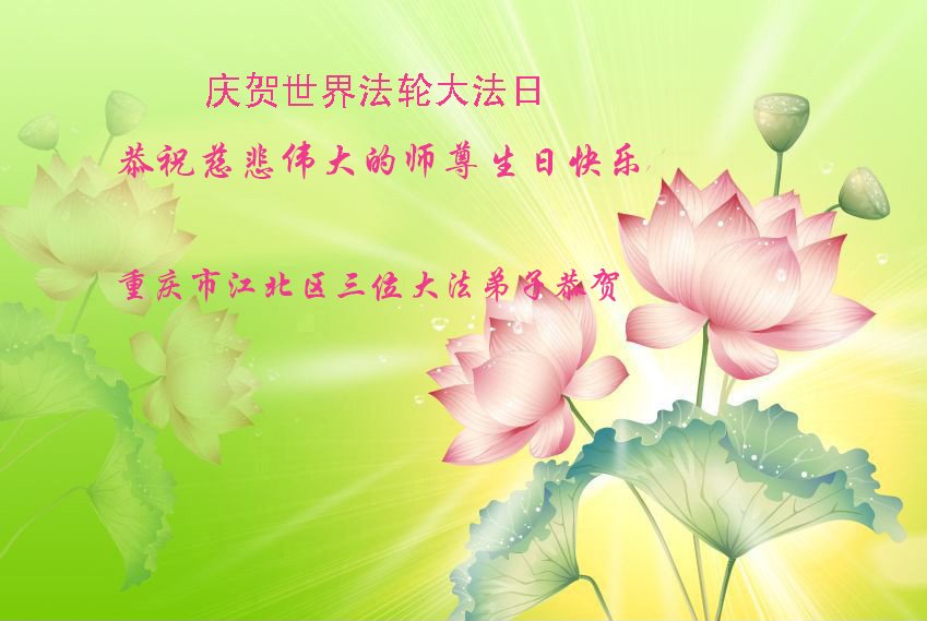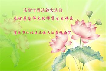 重庆市江北区三位大法弟子恭祝慈悲伟大的师父生日快乐!庆贺世界法轮大法日!