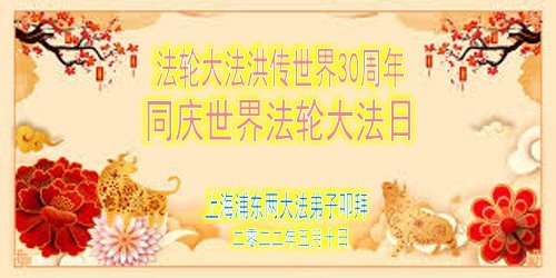 【明慧网二零二二年五月十四日】 上海浦东两大法弟子恭祝师尊生日快乐!恭贺世界法轮大法日!