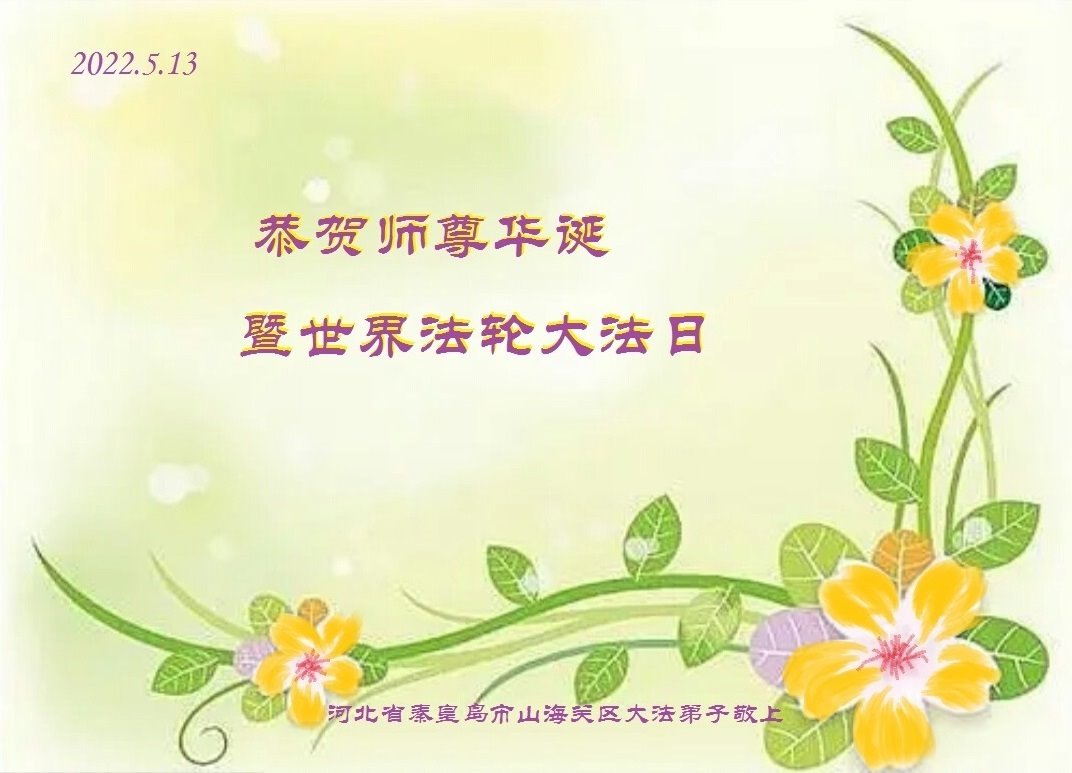 在世界法轮大法日来临之际,弟子恭祝师父生日快乐! 弟子感恩师尊慈悲救度,在正法最后时刻,修好自己、放下自我,处理好家庭关系,整体配合好,同化大法,多救人,学好法,提高心性,去私心,做好三件事,走向神! 庆祝法轮大法日 神圣庄严又隆重 天地人间同庆祝 宇宙众生笑开颜 善待大法结善缘 学法修心不懈怠 修去执着增神念 随师正法世间行 佛光普照新天地 返本归真回家园 唐山大法弟子 2022年5月6日 河北省唐山市丰润区一学法小组九姐妹大法弟子祝恭祝师父生日快乐!