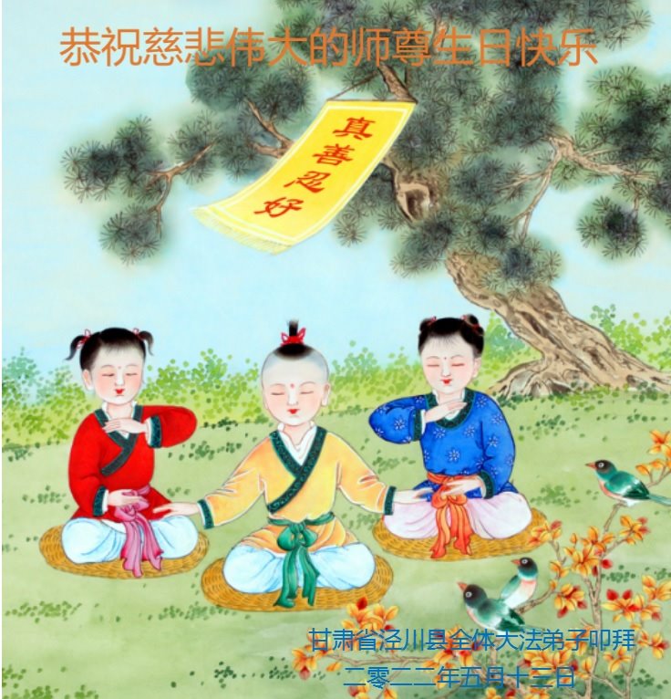 拜师恩 陇上江南风景美如画 域内秦州民风纯似水 大法洪传修者已日众 祛病健身邻里更和睦 旧势红魔毁人散谣言 龙城法徒助师上京城 牢狱酷刑志向坚如盘 街头巷尾真相传递忙 九字真言警民普认同 中共病毒小城欲肆掠 佛光普照再次阴霾散 秦州弟子师恩感于心 修炼如初精進多救人 五月十三大法洪传日 天水弟子跪拜师尊好! 甘肃天水大法弟子敬上 二零二二年五月十一日 甘肃兰州一学法小组大法弟子恭祝师尊生日快乐!
