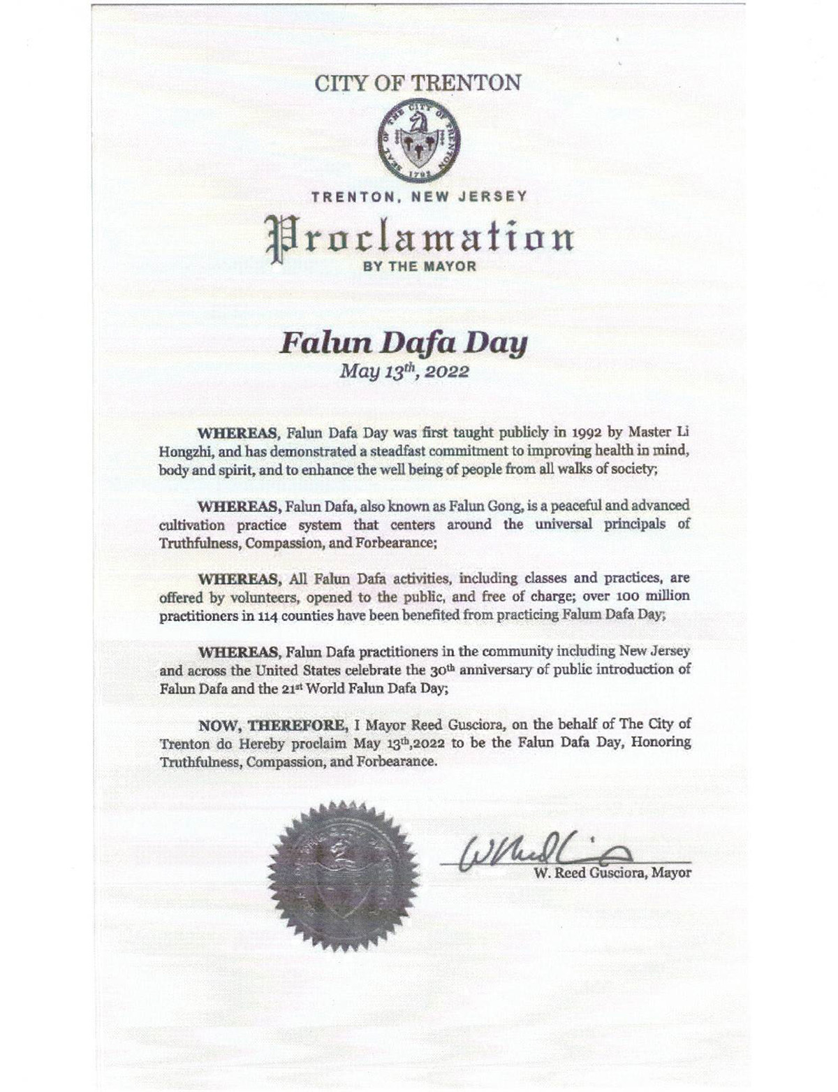 | 【明慧网二零二二年五月十四日】二零二二年五月十三日,是第二十三届世界法轮大法日,也是大法弘传世界三十周年,更是法轮功创始人李洪志先生的华诞。继美国新泽西州十二个市的市长颁布褒奖、宣布法轮大法日之后,又有六个市一个郡在褒奖令中向真、善、忍致敬,恭祝大法弘传世界三十周年,赞赏法轮大法带给世界的巨大健康益处和深刻的精神修炼之路。 这六个市一个郡包括:新泽西州首府川顿市(City of Trenton),伯纳兹市(Township of Bernards),南邦布鲁克市(Borough of South Bound Brook),邦德布鲁克市(Borough of Bound Brook),蒙特克莱尔市(Township of Montclair),门罗市(Township of Monroe),埃塞克斯郡(COUNTY OF ESSEX)。  图1:美国新泽西州首府川顿市(City of Trenton)市长里德古斯多拉(W. Reed Gusciora)发来褒奖,宣布二零二二年五月十三日为“法轮大法日”,向真、善、忍致敬。 |