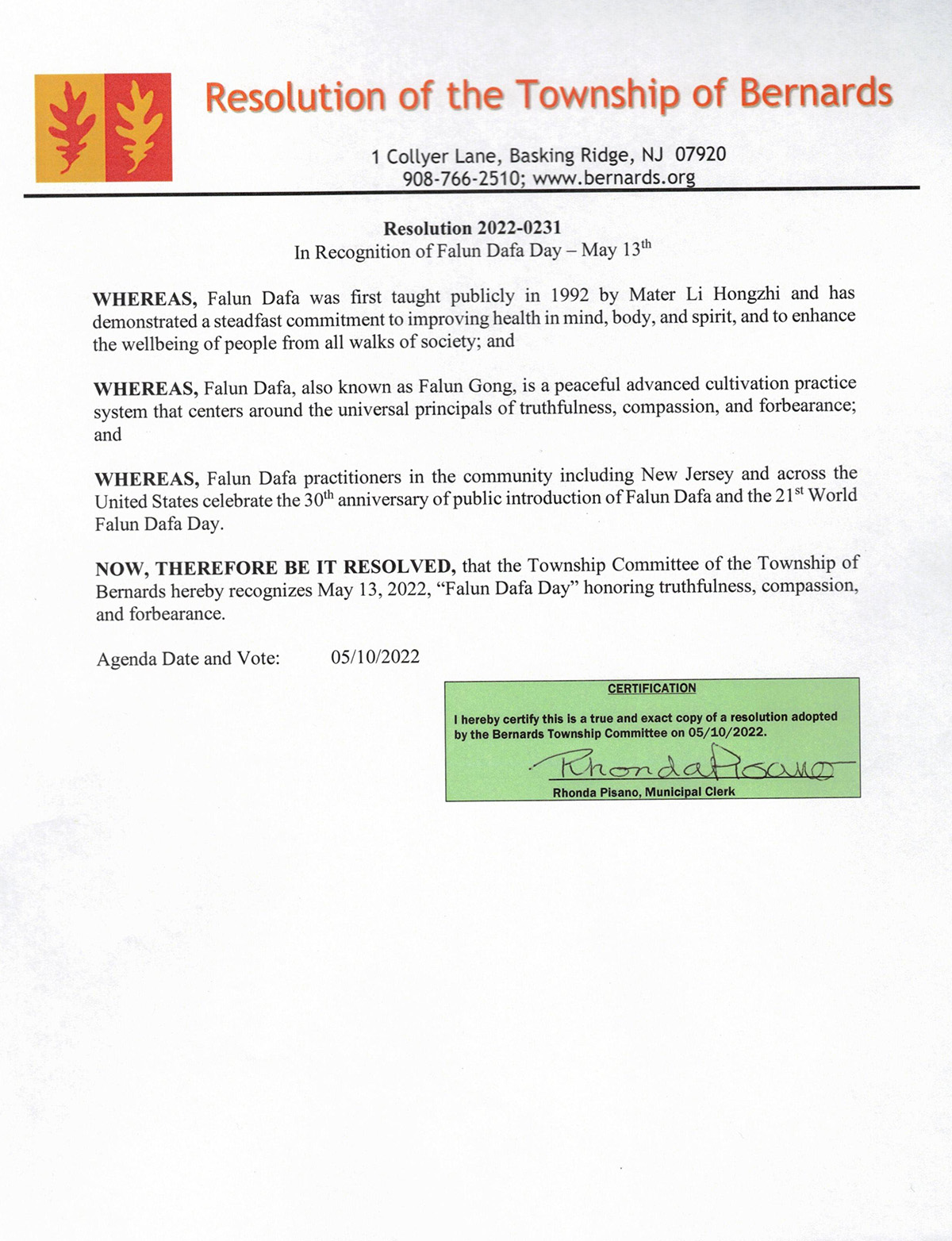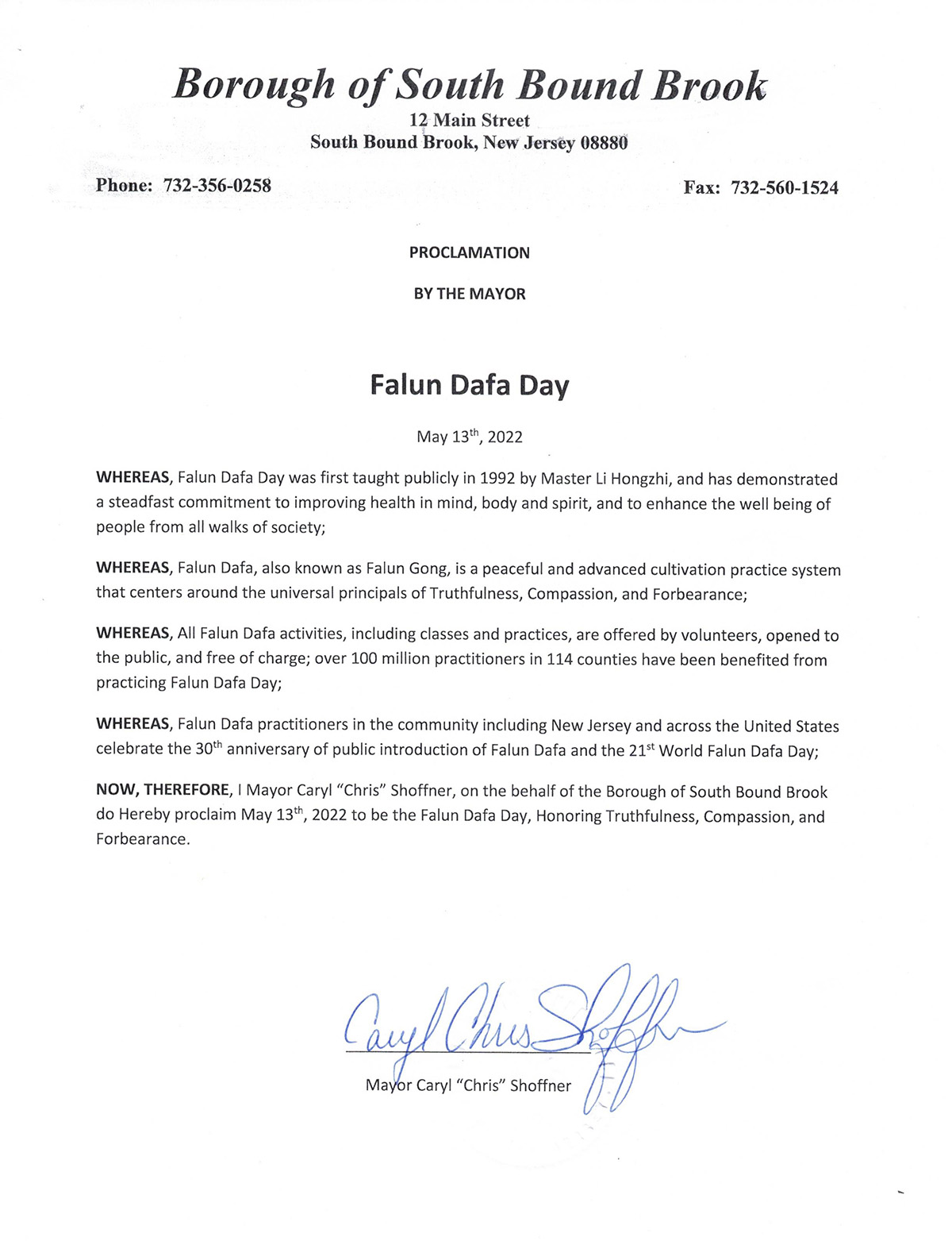 新泽西州伯纳兹市褒奖令译文如下: 伯纳兹市(Bernards) 决议 第2022-0231号决议纪念五月十三日法轮大法日 鉴于,自一九九二年法轮大法由李洪志先生首次公诸于世;显著改善了人们的身心健康,提高社会各界人民的福祉;以及 鉴于,法轮大法,也称法轮功,是基于宇宙真、善、忍特性平和的上乘修炼功法;以及 鉴于,新泽西州和包括全美各地的法轮大法修炼者庆祝法轮大法洪传三十周年、和第二十三届“世界法轮大法日”。 因此,现在,伯纳兹市委员会特此宣布二零二二年五月十三日为“法轮大法日”,致敬真、善、忍。 议程日期和投票:二零二二年五月十日认证。 证明: 我特此证明这是伯纳兹市委员会于二零二二年五月十日通过的决议的真实和精确副本。 签名:朗达・皮萨诺,市政文员  图3:新泽西州南邦布鲁克市(Borough of South Bound Brook)市长卡里尔・克里斯・肖夫纳(Caryl “Chris” Shoffner)发来褒奖,宣布二零二二年五月十三日为法轮大法日,致敬真、善、忍。 |