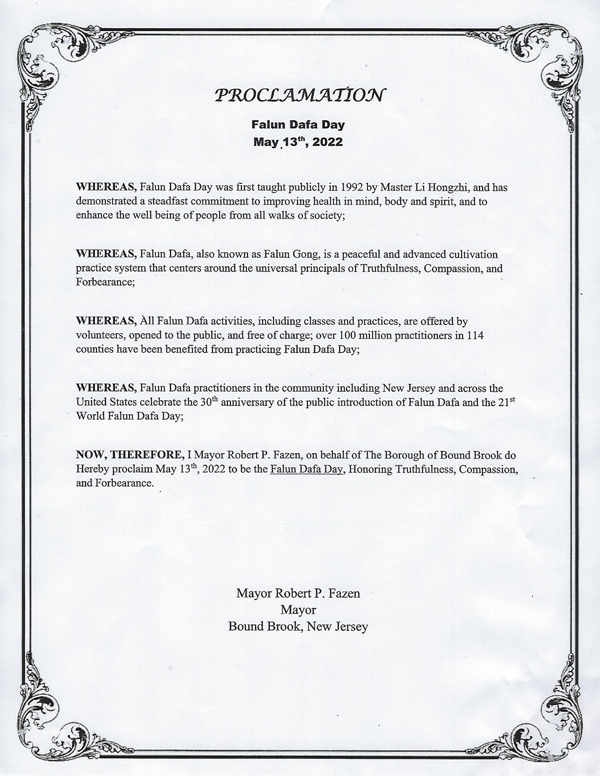 新泽西州罗格斯伯利市市褒奖令译文如下: 南邦布鲁克市(South Bound Brook) 市长褒奖 法轮大法日 二零二二年五月十三日 鉴于,自一九九二年法轮大法由李洪志先生首次公诸于世;显著改善了人们的身心健康,提高社会各界人民的福祉;以及 鉴于,法轮大法,也称法轮功,是基于宇宙真、善、忍特性,和平的上乘修炼功法;以及 鉴于,所有法轮大法的活动,包括教功都是免费的,面向公众;在世界一百十四个国家的上亿人都因修炼法轮大法而从中受益;以及 鉴于,新泽西州和包括全美各地的法轮大法修炼者庆祝法轮大法洪传三十周年和第二十三届“世界法轮大法日”。 因此,我市长卡里尔克里斯肖夫纳代表南界布鲁克市宣布二零二二年五月十三日为法轮大法日,致敬真、善、忍。 签名:卡里尔・克里斯・肖夫纳市长  图4:新泽西州邦德布鲁克市(Borough of Bound Brook)市长罗伯特・法森(Robert P. Fazen)颁发褒奖,宣布二零二二年五月十三日为法轮大法日,致敬真、善、忍。 |