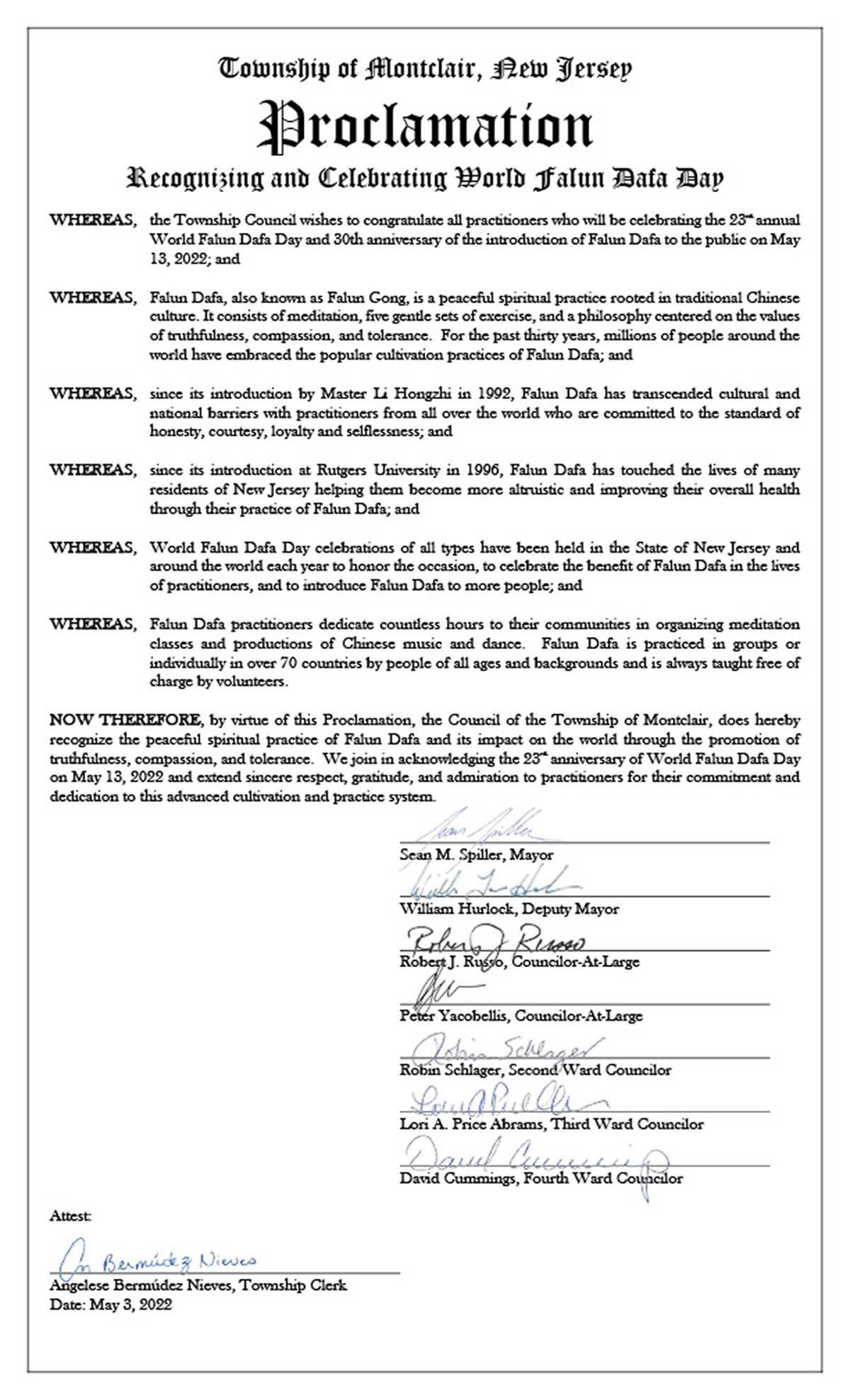 新泽西州邦德布鲁克市褒奖令译文如下: 邦德布鲁克市(Borough of Bound Brook) 褒奖 法轮大法日 五月十三日 鉴于,自一九九二年法轮大法由李洪志先生首次公诸于世;显著改善了人们的身心健康,提高社会各界人民的福祉;以及 鉴于,法轮大法,也称法轮功,是基于宇宙特性真、善、忍平和的上乘修炼功法;以及 鉴于,所有法轮大法的活动,包括教功都是免费的,面向公众;在全世界一百多个国家的上亿人都因修炼法轮大法而从中受益;以及 鉴于,新泽西州和包括全美各地的法轮大法修炼者庆祝法轮大法洪传三十周年和第二十三届“世界法轮大法日”。 现在,我市长罗伯特・法森(Robert P. Fazen)代表邦德布鲁克市特此宣布二零二二年五月十三日为“法轮大法日”,致敬真、善、忍。 签名:市长罗伯特・法森  图5:新泽西州蒙特克莱尔市(Township of Montclair)市长肖恩・M・斯比乐(Sean M. Spiller)发来褒奖,蒙特克莱尔市议会特此宣布法轮大法的和平修炼及其通过弘扬真、善、忍对世界的影响。共同庆祝世界法轮大法日二十三周年,为法轮大法修炼者对这一修炼体系的奉献表示由衷的敬意、感谢和钦佩。 |