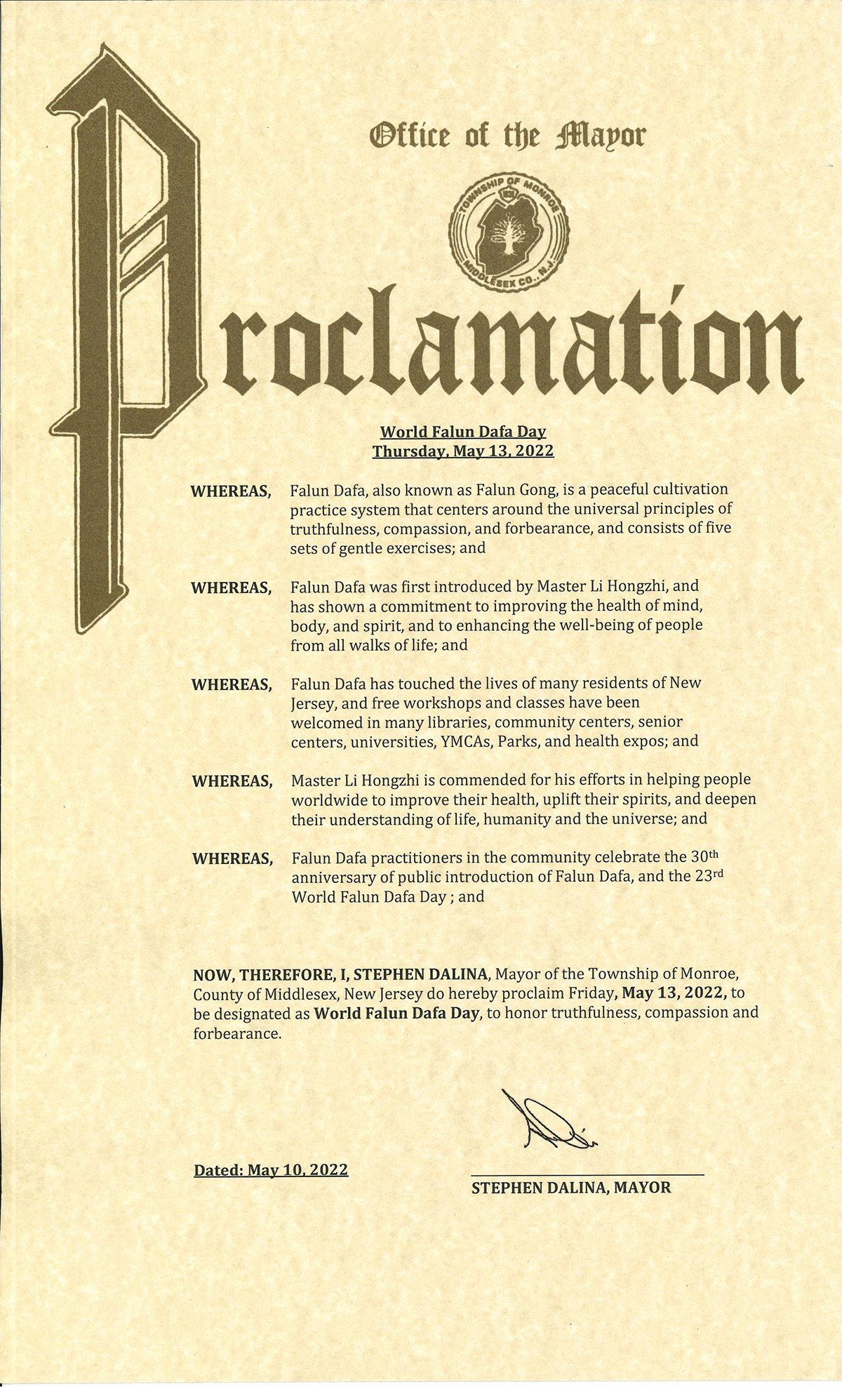 新泽西州蒙特克莱尔市褒奖令译文如下: 新泽西州蒙特克莱尔市(Montclair) 发布的褒奖令 庆祝世界法轮大法日 鉴于,市议会祝贺将于二零二二年五月十三日庆祝第二十三届世界法轮大法日和法轮大法洪传三十周年的法轮功学员;以及 鉴于,法轮大法,也称法轮功,是基于宇宙真、善、忍特性的上乘修炼功法,包括打坐和缓慢的动功.三十年来,全世界有数百万人修炼法轮大法功法;以及 鉴于,自一九九二年法轮大法由李洪志先生首次公诸于世,法轮大法跨越文化和种族界限,有助于营造一个和平、宽容和更融洽的社会;以及 鉴于,自一九九六年在罗格斯大学推出以来,法轮大法已经感触了许多新泽西州居民的生活,帮助他们变得更加无私,并通过修炼法轮大法改善了他们的整体健康; 鉴于,每年在新泽西州和世界各地都会举行各种形式的世界法轮大法日庆祝活动,以纪念这一时刻,庆祝法轮大法修炼者在修炼后生活中得到的益处,并向更多人介绍法轮大法;以及 鉴于,法轮大法修炼者为社区组织了免费功法教导和制作了各种中国音乐和舞蹈的表演而投入了无数时间。法轮大法在七十多个国家由不同年龄和背景的人集体或单独修炼,并且始终由志愿者免费传授。 因此,根据本公告,蒙特克莱尔市议会特此宣布法轮大法的和平修炼及其通过弘扬真、善、忍对世界的影响。二零二二年五月十三日,我们共同庆祝世界法轮大法日二十三周年,为法轮大法修炼者对这一修炼体系的奉献表示由衷的敬意、感谢和钦佩。 签名: 肖恩・M・斯比乐,市长 威廉・赫洛克,副市长 罗伯特・J・罗素,议员 彼得・雅可贝利斯,议员 罗宾・施拉格,议员 萝莉・帕斯・艾布拉姆斯,议员 大卫・卡明斯,议员 认证: 安吉莱・贝穆德兹・涅维斯,郡书记 二零二二年五月三日  图6:新泽西州门罗市(Township of Monroe)市长斯蒂芬・达利娜(Stephen Dalina)发来褒奖,宣布二零二二年五月十三日为法轮大法日,并致敬真善忍。 |