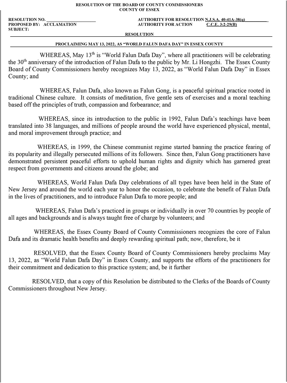 新泽西州埃塞克斯郡委员会决议译文如下: 埃塞克斯郡委员会决议 埃塞克斯郡宣布二零二二年五月十三日为“世界法轮大法日” 鉴于,五月十三日是“世界法轮大法日”,届时所有修炼者将庆祝由李洪志先生传授的法轮大法三十周年。埃塞克斯县委员会特此宣布二零二二年五月十三日为埃塞克斯县的“世界法轮大法日”;以及 鉴于,法轮大法,也称法轮功,是基于宇宙特性真、善、忍的上乘修炼功法,包括打坐和缓慢的动功;以及 鉴于,自一九九二年向公众介绍以来,法轮大法的书籍已被翻译成三十八种语言,全世界数百万人通过修炼,他们的身体,精神和道德得到了改善;以及 鉴于,一九九九年,中共政权由于害怕法轮功太受欢迎而开始禁止并迫害法轮功的修炼者,从那时起,法轮功学员为维护人权和尊严而作出了坚持不懈的和平努力,赢得了世界各国政府和公民的极大尊重;以及 鉴于,每年在新泽西州和世界各地都会举行各种类型的世界法轮大法日庆祝活动,以纪念这一时刻,庆祝法轮大法在修炼者生活中的得到的益处,并将法轮大法介绍给更多的人;以及 鉴于,法轮大法在七十多个国家盛传,有不同的年龄和背景的人修炼,并且都是由志愿者免费教功;以及 鉴于,埃塞克斯郡县委员会赞赏法轮大法的核心理念及其巨大的健康益处和深刻的精神道路; 因此,现在, 决议如下,埃塞克斯县委员会特此宣布二零二二年五月十三日为埃塞克斯郡的“世界法轮大法日”,并支持修炼者对和他们的修炼团体所做出的实践和奉献。 并且将本决议的副本分发给新泽西州各地县专员委员会的书记员。