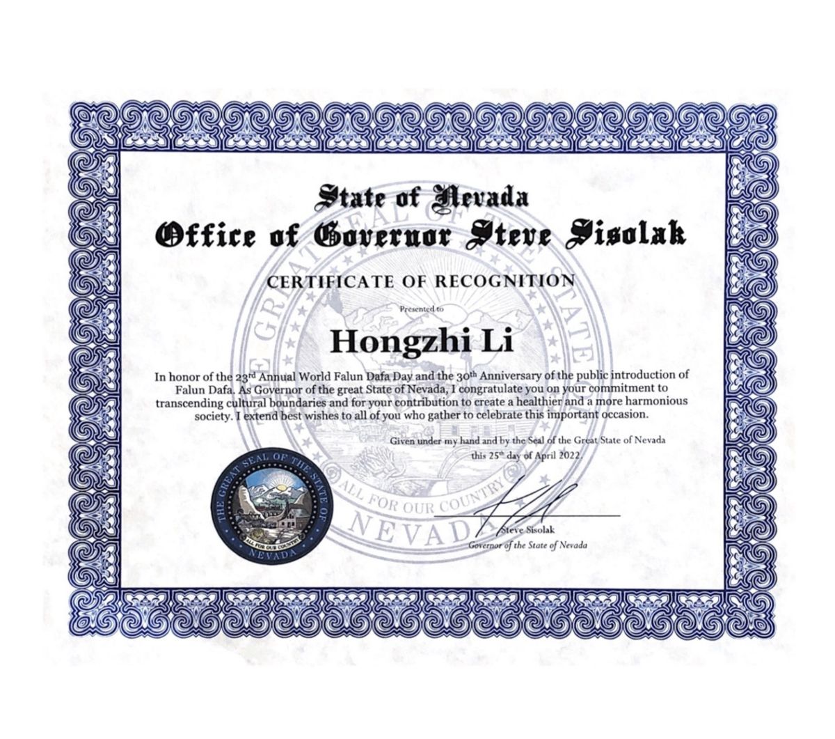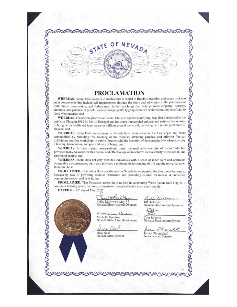 内华达州参议员、众议员签发的褒奖译文如下: 鉴于,法轮大法是一种植根于佛家传统的整体修行,由两个主要部分组成,包括通过学习和坚持真善忍的原则来提高自己,以及有助于促进同情心和诚实的进一步教义。善良,耐心,并鼓励温和的气功修炼和冥想,有益于修炼者的身心健康; 鉴于,法轮大法,又称法轮功,由李洪志先生于一九九二年在中国首次公开传出,从此超越了文化和国界。为全世界数百万人带来更好的健康和内心的平和,包括我们伟大的内华达州; 鉴于,内华达州的法轮大法修炼者一直活跃在拉斯维加斯和雷诺社区,提供免费的功法教学、参加游行,并在公共图书馆提供免费的画展和免费的学习班,以鼓励内华达人享受健康、和谐、和平的生活方式; 鉴于,在疫情后的艰难时期,法轮大法的修炼功法为许多内华达人提供了一个自然而有效的选择,让他们头脑清晰、缓解压力和获得新能量; 鉴于,法轮大法不仅使人们在患难中保持内心的平静和乐观,而且使人们对生命和宇宙有了深刻的理解; 因此,现在宣布,表彰内华达州的法轮大法修炼者通过在众多社区活动中提供锻炼指导和提高文化意识而对内华达州的贡献:并进一步宣布全州内华达人共同庆祝世界法轮大法日,因为他继续为许多人带来和平、和谐、善良和健康。 日期为二零二二年 五月 十三 日。 特蕾西·M·布朗-梅 内华达州女众议员 吉尔·迪克曼 内华达州女众议员 米歇尔·戈罗洛 内华达州女众议员 汤姆·罗伯茨 内华达州众议员 迪娜·尼尔 内华达州参议员 詹姆斯·奥伦萨尔 内华达州参议员