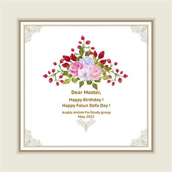 日本北海道全体大法弟子恭祝师父生日快乐!恭贺大法洪传三十周年! 感谢师父洪恩浩荡将宇宙大法传出。感恩在这伟大的时期成为大法粒子。我们会修炼如初,精進不停,对自己的修炼负责。救度一方众生,惟愿师尊笑。 阿拉伯世界的大法弟子恭祝尊敬的师尊生日快乐